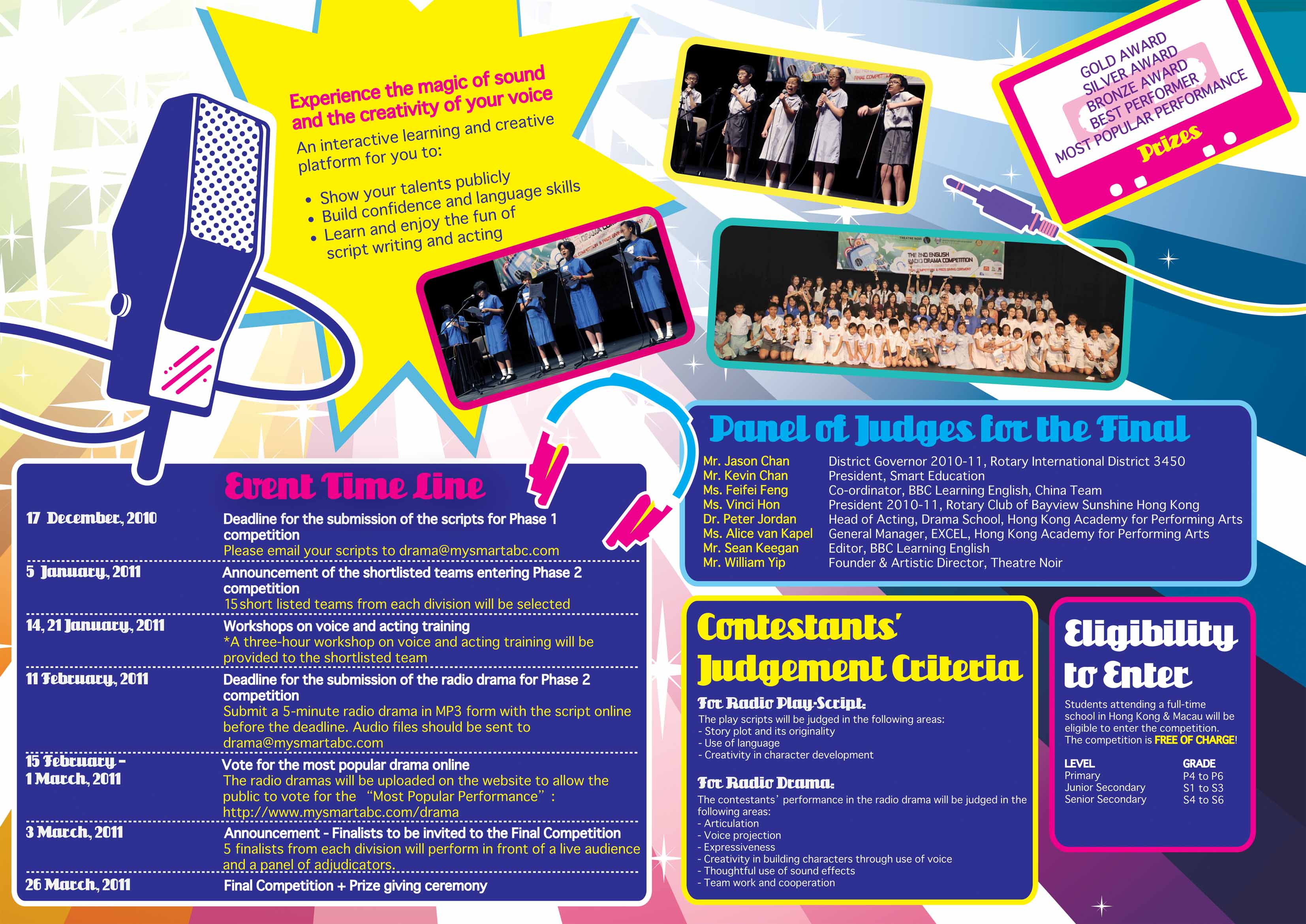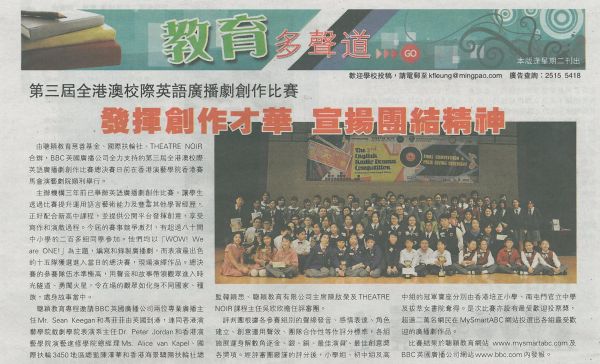 The 3rd English Radio Drama Competition for Schools in Hong Kong & Macau Posted by Smart Education, Rotary Club & Theatre Noir (8 November 2010) Enrollment is now OPEN! Ready? Action! Let's create your own radio drama and have a chance to perform LIVE at the Hong Kong Academy for Performing Arts in March 2011! This competition is co-organized by Smart Education Charitable Foundation, Rotary Club of Bayview Sunshine of Hong Kong and Theatre Noir. We are also very glad to have the support from BBC Learning English.